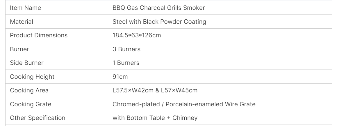 • Nos grillades et fumeurs à gaz à gaz BBQ personnalisés sont conçus pour répondre aux normes de la plus haute qualité et de performance. Nos grils à gaz BBQ sont fabriqués en acier noir enrobé de poudre pour résister aux rigueurs de la cuisson en plein air. Avec des caractéristiques comme 3 brûleurs principaux, 1 brûleur latéral, des grilles métalliques chromées ou émaillées et des tables de base et des cheminées pratiques, nos grils sont aussi beaux que fonctionnels. La taille du produit est de 184,5 * 63 * 126 cm et la hauteur de cuisson est de 91 cm, offrant un espace suffisant pour tous vos besoins de grillade. Que vous organisiez une fête de barbecue d'arrière-cour ou que vous profitiez simplement d'un repas de famille décontracté, nos grilles à gaz BBQ sont sûrs d'impressionner.